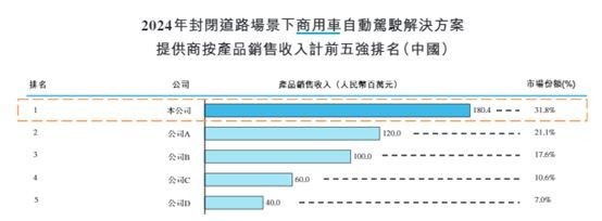 招股书援引弗若斯特沙利文的资料称,按2024年的产品销售收入计,公司是封闭道路场景下中国规模最大的L4级自动驾驶卡车及解决方案提供商,市场份额为31.8%。