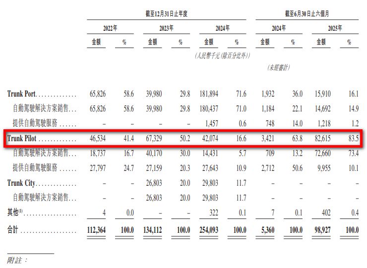 具体来看,2022年、2023年、2024年、2025年上半年(以下简称报告期)公司的主要收入来源为Trunk Pilot,收入占比分别为41.4%、50.2%、16.6%和83.5%,波动较大。而公司Trunk Port的收入占比则从2024年的71.6%骤降至今年上半年的16.1%。此外,Trunk City在2022年、2024年上半年和2025年上半年均未产生任何收入。
